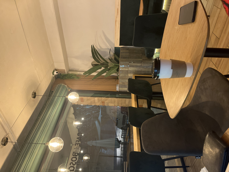 A tilted shot reveals a cafe interior. A round wooden table hosts a phone and a takeaway coffee cup. Several black chairs surround the table. A large plant sits in a stone-like container. Through the window, a view of the outside street is seen, with lights and possibly a car. The cafe's name, "CAFE 1905 BOSCO," is visible on the window. Round, hanging light fixtures are also present.
