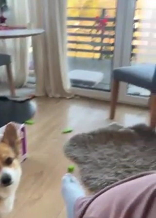 interior of a room, focusing on a person sitting on the floor with a cup of tea and a corgi dog