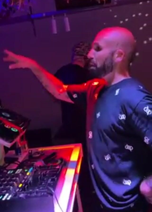 Here's a breakdown of the video: The video appears to be shot indoors in a club or party setting. The lighting is dim with red and blue highlights. In the foreground, there's a person with curly hair in a black shirt making faces and sticking out their tongue. In the background, there's a DJ with a shaved head, a beard, and tattoos on his arms, wearing a patterned blue shirt. He's standing behind a DJ console with lights. Another person in a black shirt and cap is behind the DJ, partially visible. The DJ is gesturing with his arm as if engaging with the music. Decorations, including hanging plants and a spotlight, are visible in the background. The focus is primarily on the person in the foreground making faces.