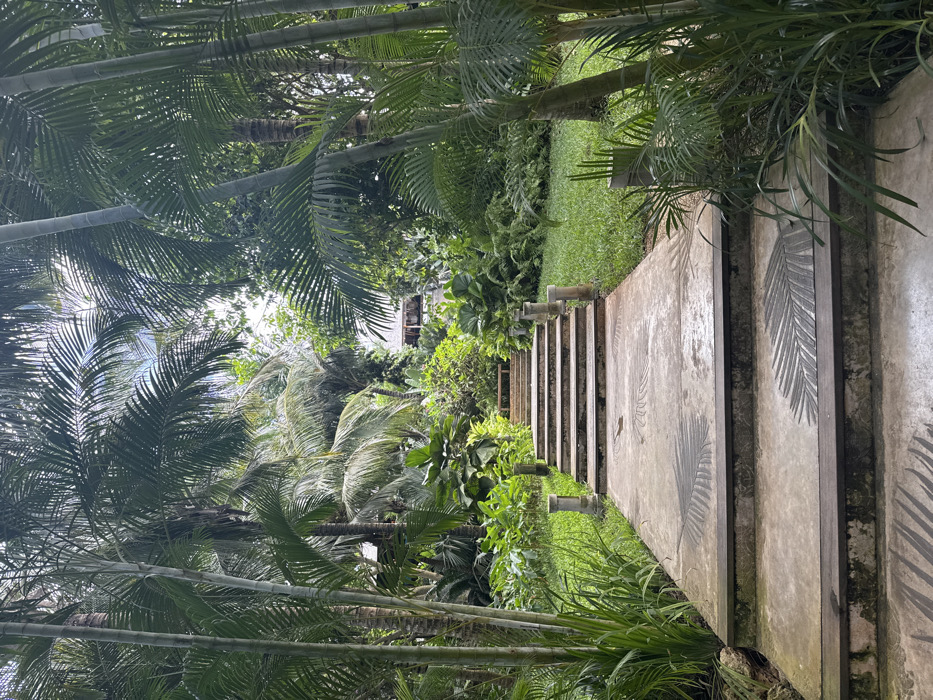 A long, straight concrete staircase ascends through a tropical garden. Palm trees frame the view, casting shadows on the steps, some decorated with leaf prints. Green grass and lush vegetation flank the staircase, leading towards a brighter, verdant area with glimpses of a building. The perspective emphasizes the length of the staircase and the surrounding dense foliage.