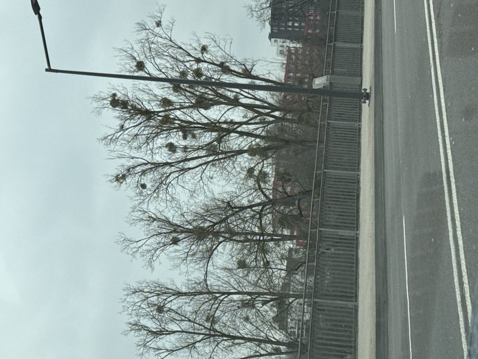 The image displays an urban landscape in Kehl, Germany, on an overcast day. In the foreground, a wet asphalt road surface extends across the bottom, marked by two parallel solid white lines and one dashed white line. Adjacent to the road is a concrete sidewalk. A black metal streetlight pole with an attached luminaire and a small grey utility box at its base stands on the sidewalk, positioned right of center. A grey metal railing, composed of vertical bars and horizontal elements, spans the mid-ground, serving as a barrier. Beyond the railing, several leafless deciduous trees are visible, prominently featuring numerous dense, spherical clumps of mistletoe attached to their branches. In the background, visible through and above the trees, are multiple multi-story buildings, including a red-colored structure in the center and a dark-colored, multi-story building on the far right. The sky is uniformly light grey and overcast. No people or active elements are discernible in the scene.