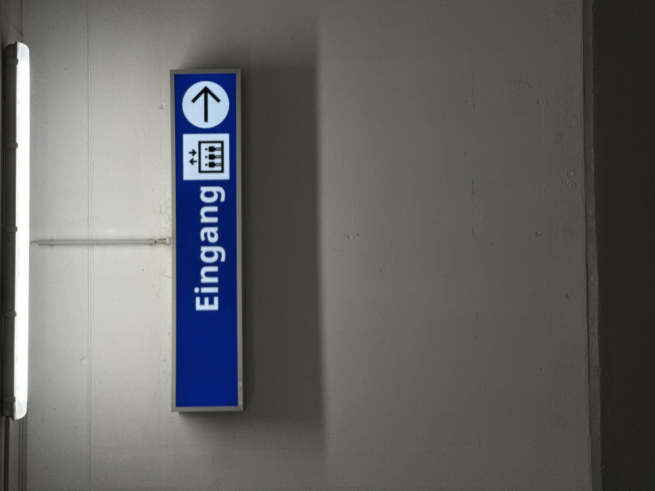 - "An indoor scene in Kassel, Germany, depicts a blue rectangular illuminated sign mounted centrally on a light gray wall" by FM-12qP82, licensed under CC BY 4.0