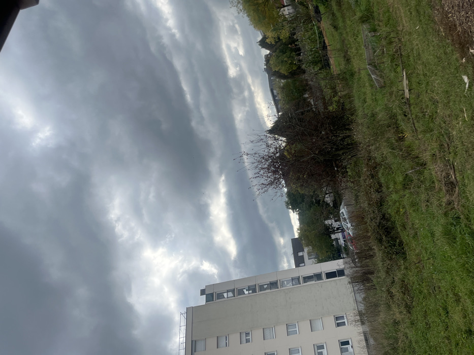 The image displays an urban residential scene in Strasbourg, France, under a heavily overcast sky. In the foreground, a patch of unkempt grass and dry vegetation covers the lower frame, interspersed with areas of exposed earth. Towards the lower right, sections of wooden debris or a disused raised garden bed are visible on the ground. A sparse, deciduous shrub with mostly bare branches stands centrally in the mid-ground. Behind it, a row of trees and shrubs, some still green and others displaying autumnal colors, partially conceals a residential street or parking area where at least two vehicles, including a light-colored sedan, are parked. On the far left, a prominent, multi-story, light-colored residential building, characterized by numerous windows and dark-railed balconies, dominates the left portion of the frame. The building features a flat roof with a visible railing. Further in the background, another residential structure with a darker roofline is partially visible amidst trees. The sky is uniformly covered by dense, grey stratocumulus clouds, with some brighter areas indicating indirect light. No individuals or discernible actions are depicted.