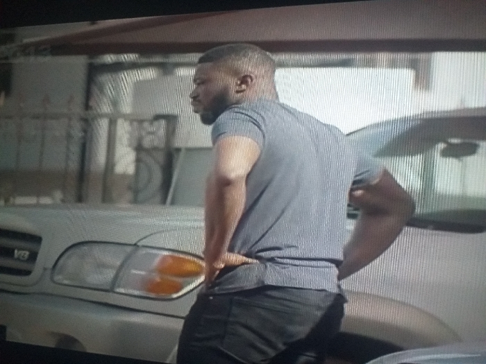 The scene depicts an outdoor urban or semi-urban environment. Visual markers within the image do not definitively identify the specific location as Masaka, Nigeria. A single male subject is prominently featured in the foreground, viewed from his upper back and right side profile. He has a dark complexion, short dark hair, and a neatly trimmed beard. He wears a light-colored, possibly grey or light blue, short-sleeved collared shirt with thin vertical stripes, and dark trousers or jeans. His hands are placed on his hips, and his head is turned slightly to the left, indicating he is looking in that direction. The subject appears to have a muscular build. Behind the man, to his left, is the front section of a light-colored SUV or truck, possibly silver or beige. The "V8" emblem is visible on its grille or hood, and its headlights and amber turn signals are clearly discernible. This vehicle resembles a first-generation Toyota Sequoia. To the man's right, and further back, a portion of another vehicle is visible, showing part of its roofline and a reflective windshield. The background behind the vehicles includes indistinct light-colored walls or structures, with some metallic elements, possibly fencing or structural supports. The lighting suggests it is daytime. The overall image exhibits characteristics of a screen capture from video footage, with noticeable scan lines.