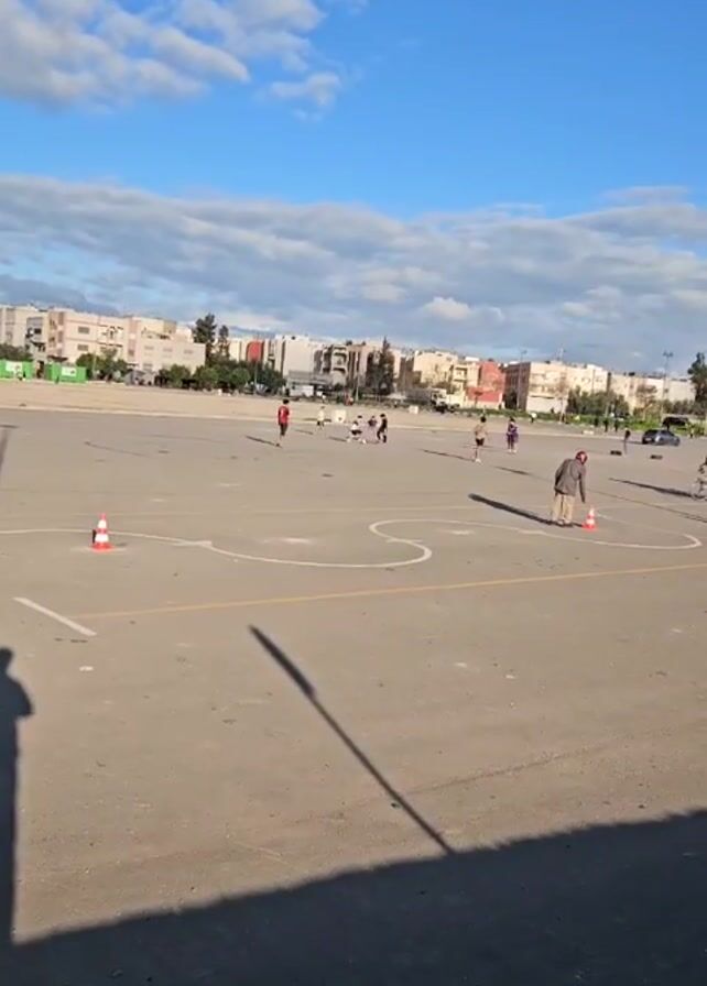 The scene takes place on a large, open, paved area marked with yellow lines, with several individuals dispersed around