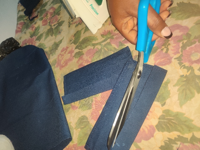 A dark-skinned hand with black-tipped, natural-base fingernails holds a pair of large silver scissors with blue plastic handles, actively cutting a strip of dark blue fabric. The fabric strip, approximately 3 inches wide, is positioned horizontally on a light-colored surface adorned with a pink, green, and beige floral pattern. Another similar dark blue fabric strip lies parallel to the one being cut. In the upper left quadrant, a larger folded piece of the same dark blue fabric is visible. To the upper right, a white and green object partially labeled "Precision" is present, along with a crumpled dark object and a small dark blue fabric item. This scene depicts a tailoring or craft activity in New Stadium, Nigeria.