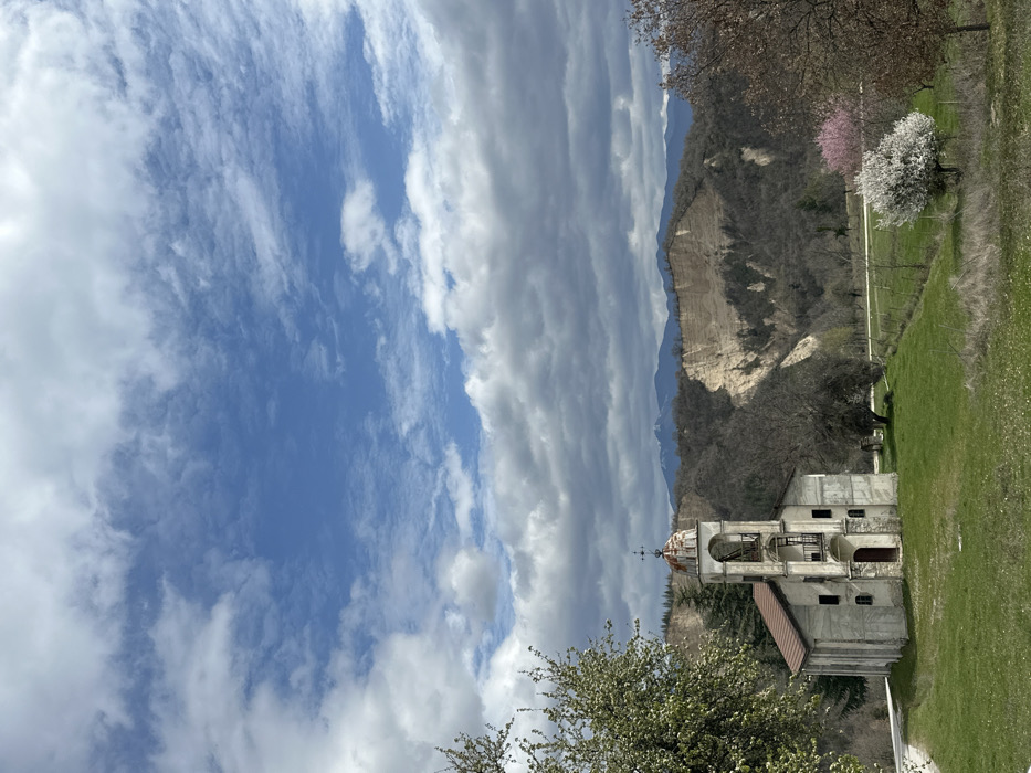 An external view captures a scene in Rozhen, Bulgaria, featuring a weathered church or chapel positioned on a verdant grassy knoll. The church, constructed from light-colored masonry, possesses a prominent bell tower with an arched opening and a reddish, domed roof topped with a cross. Dark, rectangular windows punctuate its sides, and a dark wooden door marks the entrance. A narrow paved path ascends towards the structure from the left. The immediate foreground consists of green grass interspersed with patches of drier vegetation. Beyond the church, the landscape transitions into hills characterized by extensive, light-tan geological formations resembling eroded cliffs or pyramids, indicative of the Rozhen Pyramids. Denser, dark green forest covers other sections of these hills. Further in the midground, a solitary white-blossomed tree stands out on the right, with another pink-blossomed tree nearby. Trees with nascent green foliage are visible on the far left. In the distant background, mountains, some capped with snow, rise beneath a sky that exhibits a mixture of clear blue patches and expansive, white to grey stratocumulus clouds. No individuals or discernible actions are present within the frame.
