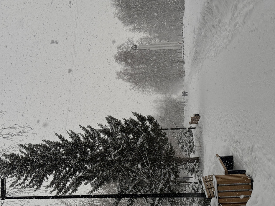 A snow-filled landscape shows a path lined with trees and benches. Snow accumulates deeply along the path, almost obscuring the benches. Flurries of snow obscure vision. Two figures are visible in the distance, walking along the snow-covered path. Bare trees without leaves are covered by the snow.