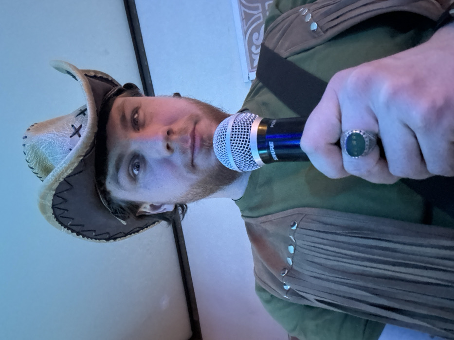 A man wearing a cowboy hat and fringed vest holds a microphone