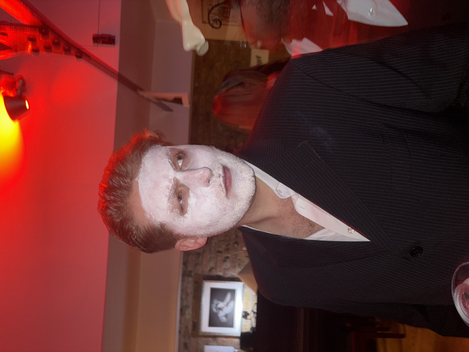 The scene is an indoor public or event venue, under strong red artificial lighting, in an undetermined location within the city of London, United Kingdom. A male subject, standing in the foreground, wears a dark pinstriped suit jacket over an unbuttoned white shirt, exposing chest hair. His face is entirely covered with a white cosmetic substance, including his eyebrows and facial hair areas, contrasting with his reddish-brown hair. He holds a clear plastic cup with a metallic can inside, visible in the lower left. His head is turned to the right, away from the direct line of sight. The background features an exposed brick wall with a framed black and white photographic print depicting a woman. A dark piano is partially visible on the left. Blurry figures of other individuals are present in the right background. The ceiling displays red and orange-yellow light sources, consistent with a themed event or social gathering.