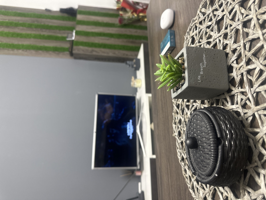 The image depicts an interior room in Sofia, Bulgaria. In the immediate foreground, a dark, woven cylindrical container with a spherical black knob on its lid rests on a light brown, woven circular placemat. To its right, also on the placemat, is a small, square, grey concrete pot containing a green faux succulent plant. The pot is inscribed with "Life. Breath. Together...". On the dark brown table surface behind these items, a blue and white rectangular package, resembling a cigarette box, and a white oval object, consistent with an earbud charging case, are visible. The background features a white media console or low shelf unit against a grey wall. Centered on the console is a flat-screen television with a silver bezel, displaying a dark scene with white text, suggesting content such as a movie or television show. To the left of the TV, a dark diffuser with sticks is present. To the right of the TV, a small yellow candle in a clear holder and a dark decorative object are visible. Further to the right, a tall piece of furniture with alternating vertical grey/brown wood and green striped panels is partially visible, alongside a bouquet of red flowers wrapped in red paper. The specific location within Sofia, Bulgaria, is not discernible from the image. No individuals are present.