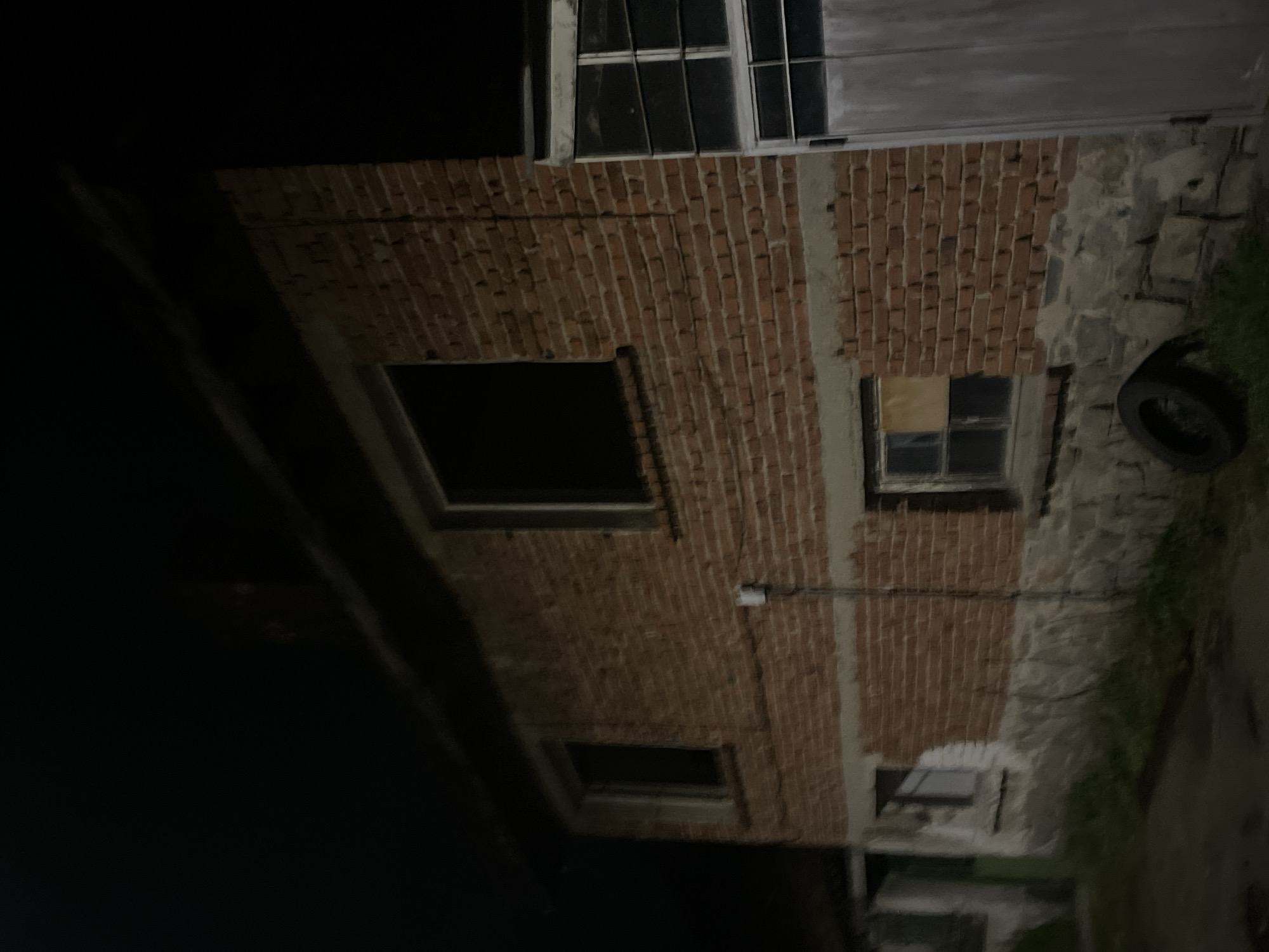 The image depicts the exterior of a building at night. The building has a brick facade with multiple windows. The upper section of the building has a white-framed window with multiple panes, while other windows are boarded up or dark. To the right side of the building, there is a section of stone foundation and a tire leaning against the wall. The ground is partially visible with some vegetation. There is no clear indication of people or actions. The environment is dark, suggesting an outdoor setting at nighttime. There is nothing visible to confirm the location in Trud, Bulgaria.
