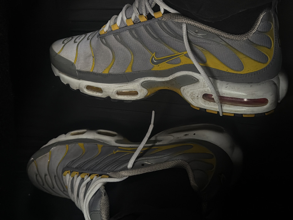 The scene displays a close-up, overhead view of two feet wearing worn grey and yellow Nike Air Max Plus athletic shoes, resting on a uniformly dark, featureless surface