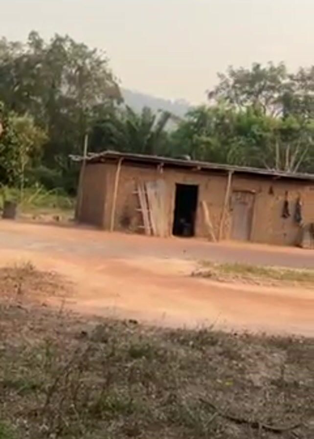 rural scene, likely in a tropical or subtropical region. In the center is a small, rectangular structure with mud walls and a simple roof. To the side, under a makeshift shelter, a group of people is sitting, possibly socializing. A dirt road runs in front of the building and shelter. The surrounding environment consists of lush vegetation, including trees and smaller plants. In the background, there's a hill or mountain visible through the trees. The lighting suggests it's either early morning or late afternoon. There is minimal activity observed beyond the stationary group under the shelter. The overall impression is one of a simple, rural life.