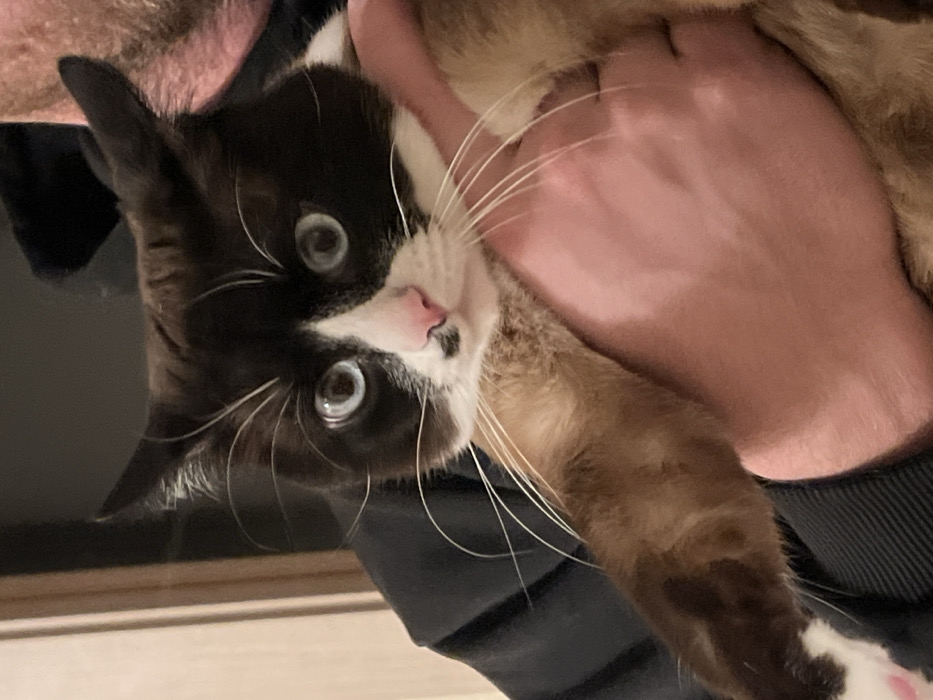 - "A tuxedo cat with a pink nose and striking blue eyes is held upside down" by FM-eMutn2, licensed under CC BY 4.0
