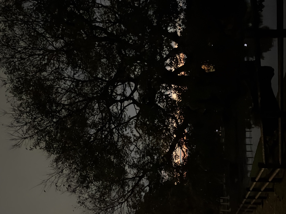 The image depicts a twilight scene at Sarusawa Pond in Nara Park, Nara, Japan. A large deciduous tree, silhouetted against the sky, dominates the central and upper portions of the frame, its dark branches and foliage obscuring much of the background. Glimpses of the sky through the leaves reveal a gradient from dark grey at the top to warm orange and pink hues near the horizon, indicative of either dusk or dawn. In the foreground, a dark wooden fence or railing runs horizontally along the bottom left, bordering a still body of water. The water surface dimly reflects the surrounding darkness and faint distant lights. On the far side of Sarusawa Pond, indistinct structures and distant light sources are barely discernible against the low light conditions. No individuals, animals, or specific activities are visible within the frame.