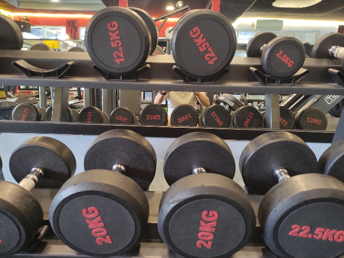The image depicts an indoor gym setting. There are no identifiable features within the image to confirm a specific location within the city of Staufenberg, Germany. The primary subjects are multiple rows of dumbbells arranged on a black metal storage rack. In the immediate foreground, a bottom tier of the rack displays several black rubber-coated dumbbells with silver or chrome handles. Visible weight denominations in red lettering on black circular ends include "20KG" and "22.5KG". Above this, a second tier holds additional dumbbells, with "12.5KG" and "2.5KG" clearly visible on their ends. Behind the foreground dumbbell rack, a large reflective surface, likely a mirror, extends across the scene. This mirror reflects a third row of dumbbells, showing denominations such as "30KG", "32.5KG", "35KG", "42.5KG", and "52KG" (some text appears reversed due to reflection). The reflection also reveals other gym equipment, including a dark-colored fitness machine, possibly a treadmill or elliptical, further in the background. A partial view of an individual wearing a light-colored shirt is visible in the mirror's reflection, standing among the gym equipment. The environment includes a dark ceiling with visible lighting fixtures and a red accent wall visible in the upper left background reflection. No specific actions or interactions beyond the static arrangement of equipment are observable.