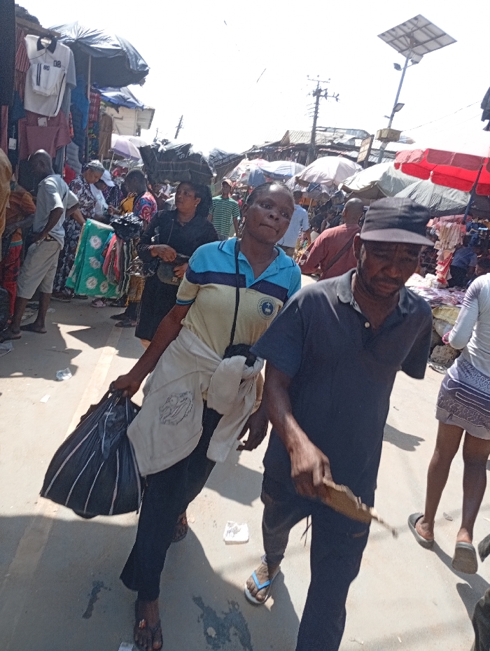 A bustling outdoor market scene displays several individuals traversing a sunlit pavement. A woman in a blue and beige shirt carries a large black bag and has a jacket draped over her shoulder. A man in a black polo shirt and cap walks alongside her, holding a banana-like fruit. Vendors with colorful umbrellas and assorted merchandise create a dense backdrop of commerce. Clothing items hang from makeshift stalls, and several pedestrians navigate the crowded marketplace.