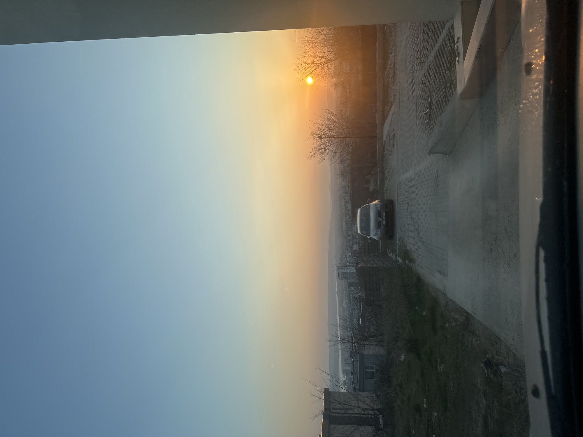The image presents a sunset over the city of Varna, Bulgaria, viewed from an elevated position within a vehicle, indicated by the visible dashboard at the bottom. The sky transitions from a light blue at the top to a vibrant orange and yellow on the horizon, where the sun appears as a bright, intense yellow orb, partially obscured by leafless tree branches on the right. A panoramic view of Varna unfolds across the middle ground, featuring numerous buildings of varying sizes and densities. In the distance, a large body of water, consistent with Varna Lake or the Black Sea, is visible, with distant landmasses on the far horizon. In the foreground to the left, a sloped area of dry, uneven ground with sparse, bare trees and bushes is present. Several small, functional-looking buildings, including one with a light-colored flat roof, are situated among the vegetation, with some visible debris on the ground. Centered in the mid-ground, a gray Volkswagen Golf V with Bulgarian license plate H 0050 BX is parked on a paved surface made of gray interlocking blocks. To the right of the vehicle, a dark metal fence runs horizontally. Further right and below, a concrete ramp, also surfaced with interlocking patterns, descends, potentially leading to an underground parking facility. Small fragments of debris are scattered on this ramp. A large, light-colored vertical architectural column or wall occupies the far right edge of the frame. No individuals are visible in the scene.
