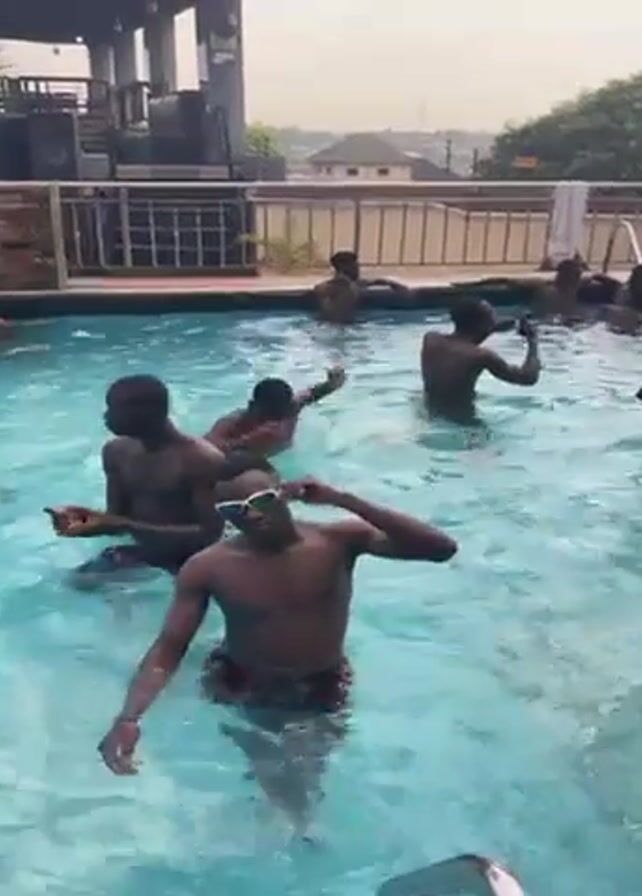 A group of bare-chested men stand and wade in an outdoor swimming pool with clear blue water. The pool is surrounded by a low railing, and beyond that is a view of buildings. Some of the men are making gestures at the camera, including a peace sign. The overall atmosphere appears relaxed and celebratory.
