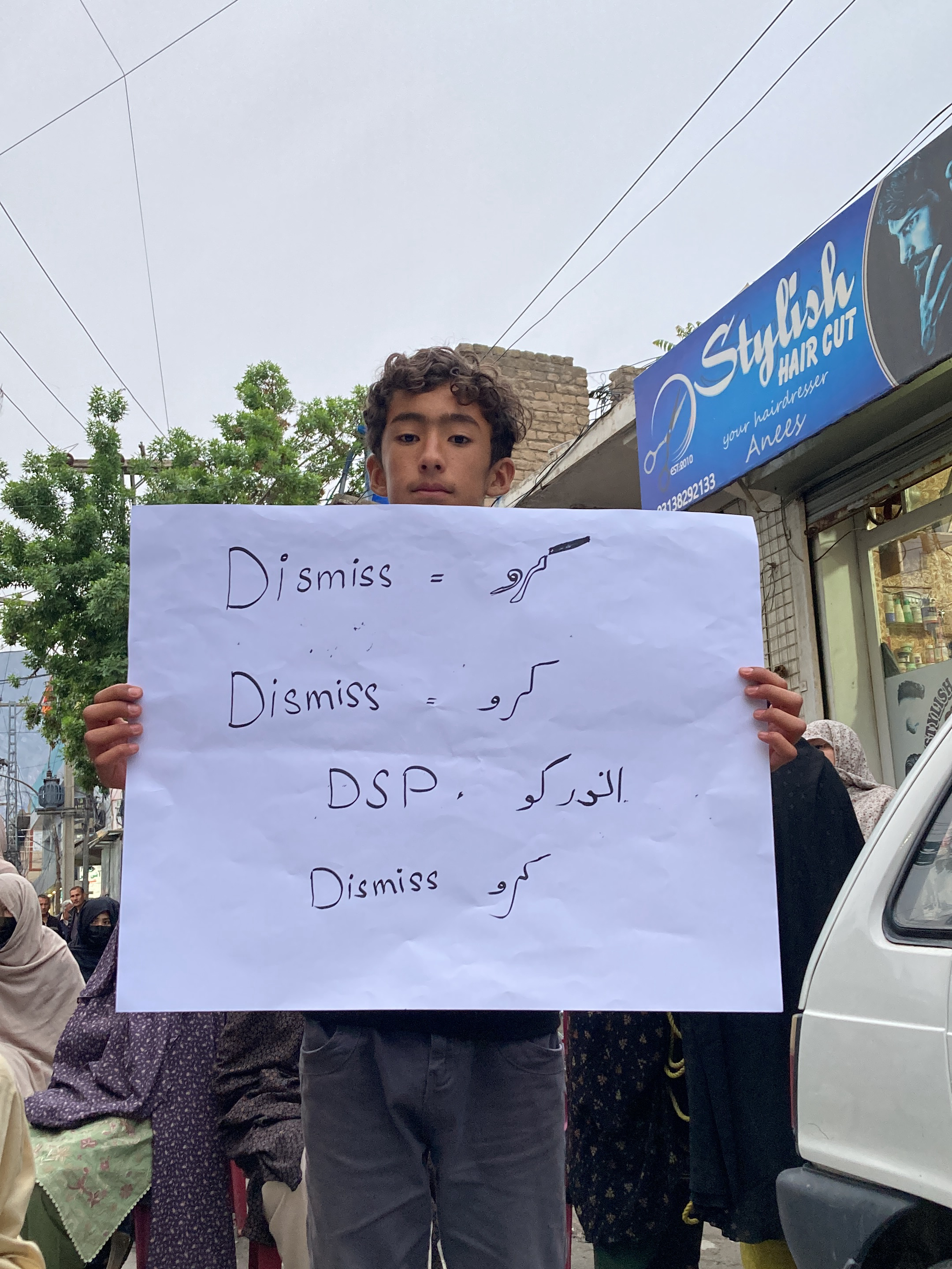 A young person is holding a sign that reads "Dismiss = Karo" in English and Urdu, followed by "Dismiss = Karo," then "DSP. Anwar ko," and finally "Dismiss Karo." The sign is being held amidst a group of people, some wearing traditional clothing. The background includes a building with a sign that reads "Stylish HAIR CUT - your hairdresser Anees" and a phone number. The scene appears to be an urban street or gathering in Pakistan.