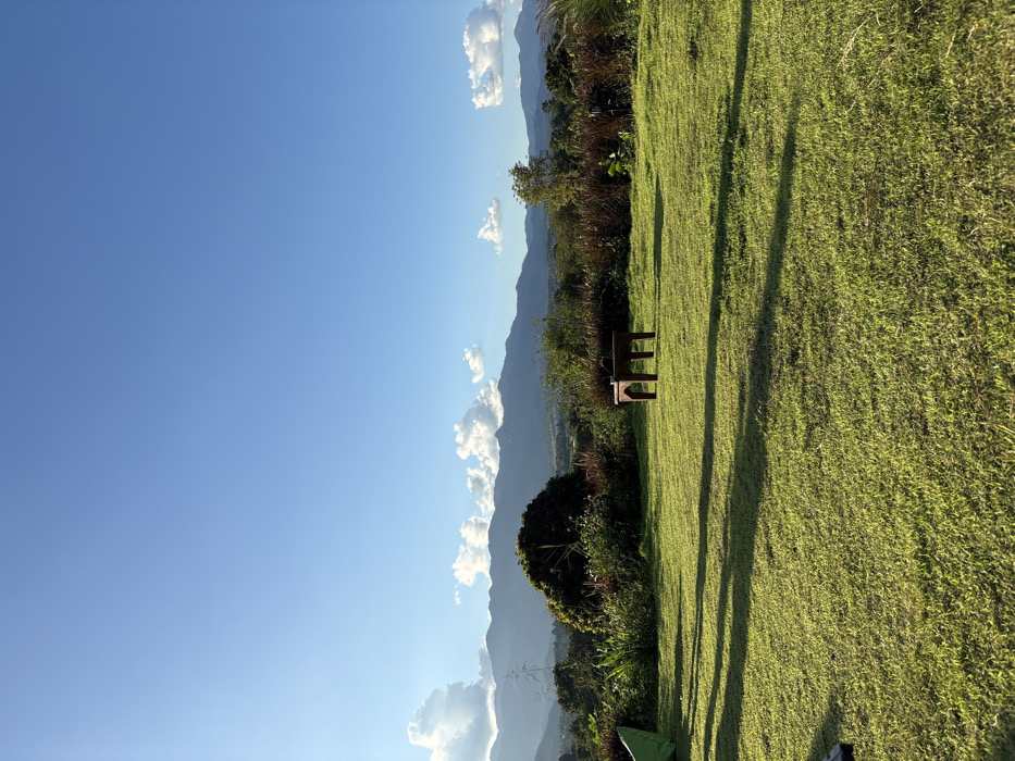 The image depicts a panoramic view of a natural landscape in Ban Mae Ping, Thailand, under a clear blue sky with scattered white cumulus clouds. The foreground consists of a well-maintained, sunlit green lawn, displaying long shadows indicative of late afternoon lighting. A small, dark brown, ornate wooden table or bench, with four legs and a flat surface, is positioned centrally in the mid-ground of the grass. To the far left, partially visible, is a vibrant green object, possibly a tent or a large piece of fabric. The mid-ground beyond the lawn features dense, wild vegetation, including various green shrubs and trees, some with reddish-brown foliage. Faintly visible on the left horizon, above the treeline, are power lines or transmission towers. The background is dominated by a majestic, distant mountain range, partially obscured by cloud cover. No individuals or active subjects are present within the frame; the scene is devoid of human activity.