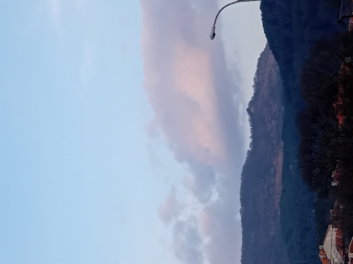 The image captures a panoramic view of a mountainous landscape in Kotel, Bulgaria, under an overcast sky illuminated by either sunrise or sunset. The upper half of the frame consists of a pale blue sky, with scattered cumuliform clouds displaying grey, white, and faint pink hues, suggesting atmospheric light conditions. The midground and background are dominated by a series of forested mountains and hills, appearing dark blue and grey, with some areas showing the bare branches of deciduous trees. A segment of the city's infrastructure is visible in the lower left, where several building rooftops with distinct reddish-orange tiles are partially obscured by dark, bare trees. On the far right, a grey, curved streetlamp extends into the frame from the bottom, its fixture positioned near the top right corner. No human figures or discernible actions are present in the scene.