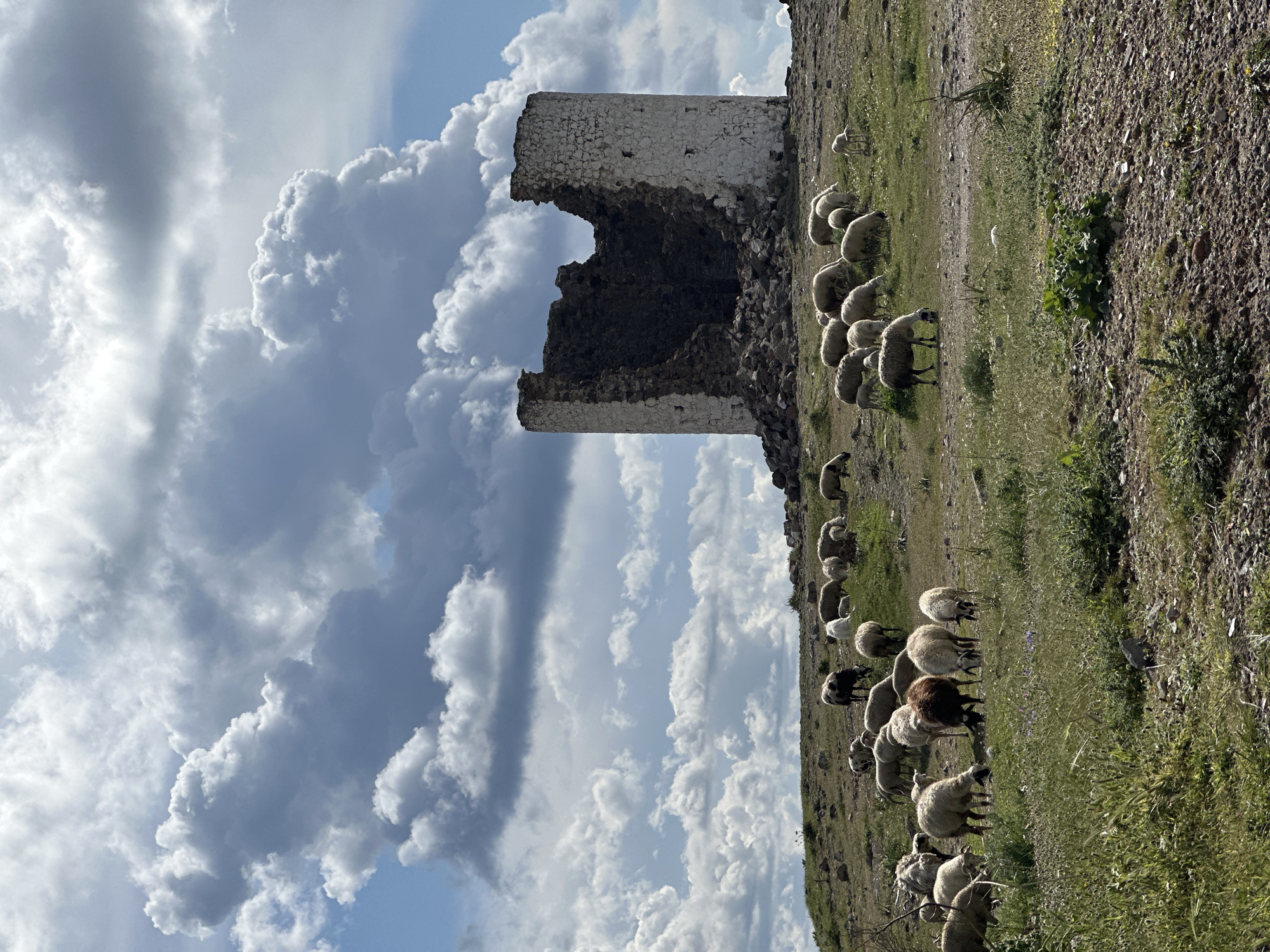 A partly cloudy daytime scene shows a landscape containing a ruined stone tower and a grazing flock of sheep. The tower, constructed of light-colored stone, is partially collapsed, with a large section of its center missing. The sheep, predominantly white with a few black and brown individuals, are spread across a grassy hillside. The terrain slopes upwards to the right. The sky is filled with large, cumulus clouds against a blue sky. The image is vertically oriented. While the exact location in Bodrum, Turkey is unknown, the scene suggests a rural area with historical ruins and grazing land, likely outside the city center.