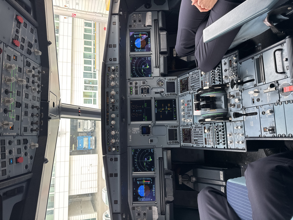 - "The image depicts the interior of an Airbus A320-214 cockpit, specifically the aircraft with registration D-AIND, stationary at a gate at Munich Airport (MUC), located in Oberding, Germany" by FM-nqtPq2, licensed under CC BY 4.0