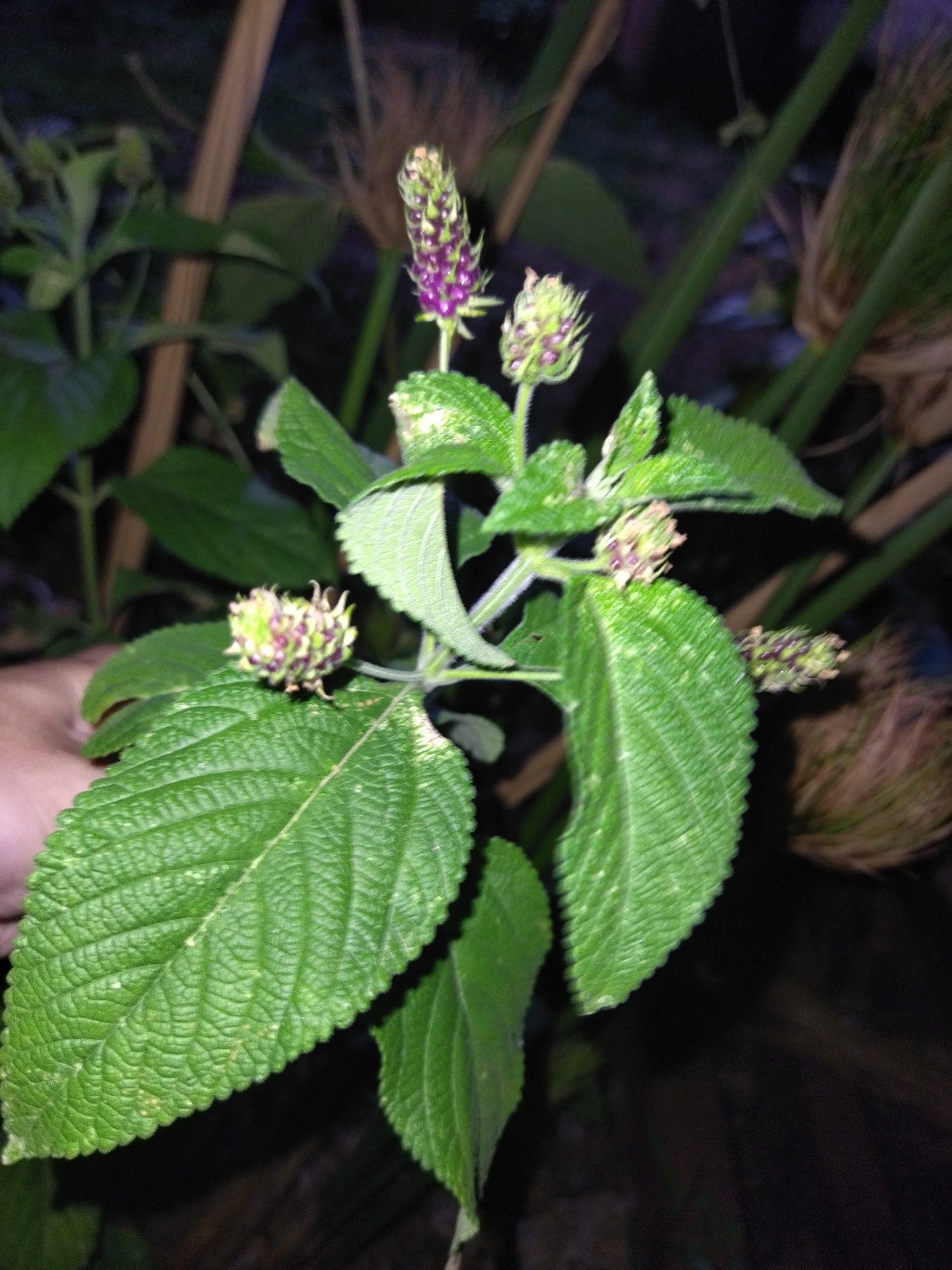 close-up of a plant with green, textured leaves and clusters of purple and green buds. The plant is growing outdoors, likely in a garden or natural setting. In the background, there are thin, brown stalks or stems. The photo was taken in dim lighting conditions. The location is Tinaquillo, Venezuela.