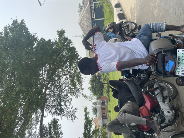 The scene depicts an outdoor setting in Itoga, Nigeria. In the foreground, a dark-skinned male subject, wearing a white t-shirt with red shoulder stripes and blue denim shorts, stands facing right, gripping the handlebars of a black motorcycle. His left foot is bare. The motorcycle displays a green license plate with "HALC5 JUR" and "OGUN NAGO." Behind him, a second dark-skinned male subject is seated on a red motorcycle, facing left, with bare feet resting on the vehicle. Several other motorcycles are partially visible nearby. The ground is a paved surface, possibly asphalt, with a low curb visible along the right side. In the background, green vegetation, including a large tree with dense foliage, dominates the upper frame, with distant buildings under a hazy sky.