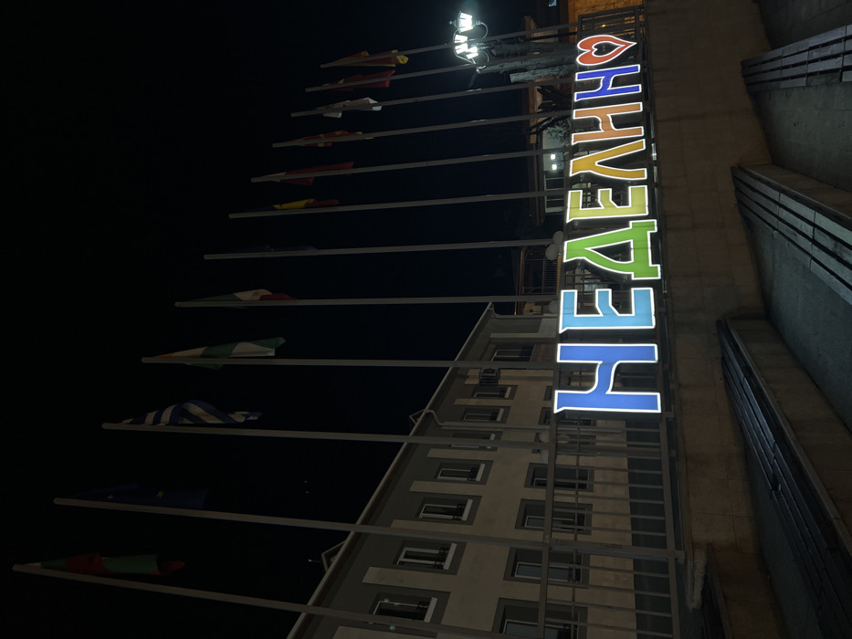 The image captures an outdoor urban scene at night in Nedelino, Bulgaria. A large, illuminated sign spelling "НЕДЕЛИНО" in Cyrillic capital letters dominates the center, displaying a gradient of colors from blue on the left to red on the right, concluding with a white illuminated heart symbol. Behind this sign and a dark metal fence, a row of at least eleven flagpoles stands. Visible flags from left to right include the Bulgarian national flag, the European Union flag, and the Greek national flag, among others, partially unfurled against a dark, clear night sky. To the left of the flagpoles, a two-story building with a light-colored facade, numerous rectangular windows with dark frames, and a prominent dark gutter system along its roofline is visible. To the right, a multi-lamp street light provides additional illumination. In the foreground, tiered wooden benches or seating platforms are arranged. No individuals are present in the scene.