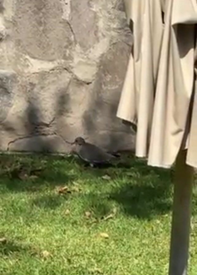 Mourning Dove walking on a grassy area near a stone wall and a closed umbrella