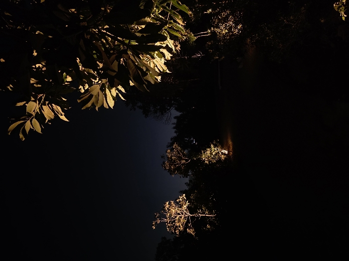 This image depicts a nighttime outdoor landscape in Savyon, Israel. Multiple artificial, warm-toned light sources illuminate specific elements of the natural environment from below. In the upper right foreground, a dense cluster of broad-leafed foliage is brightly lit, revealing yellow-green hues and intricate venation. In the mid-ground, towards the left, a slender tree with lighter bark and sparse foliage is illuminated. Further back and slightly right of center, a smaller shrub or tree base is brightly lit, casting localized light onto the adjacent ground. The background consists of dark tree silhouettes against a deep indigo-black night sky, devoid of discernible cloud cover. The ground level is predominantly obscured by shadow, appearing as an unpaved, possibly vegetated surface, with a subtle, unlit path-like depression minimally visible leading into the darkness from the mid-ground. No human or animal subjects, actions, or interactions are present.