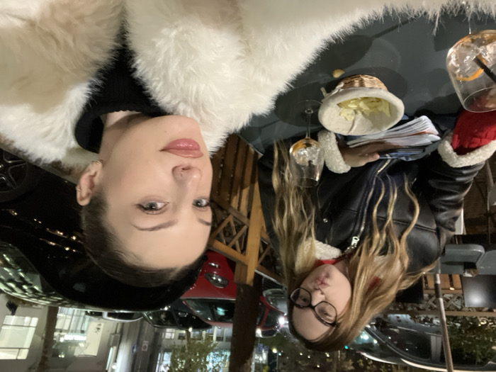 Two women are at an outdoor table, presumably at a cafe or restaurant. One woman is wearing a white furry coat, visible on the left side of the image. The other is wearing a black leather jacket lined with white fleece and glasses. A basket of chips, papers, and drinks are on the table. The overall image is rotated or captured at an unusual angle. Cars and trees are visible in the background.