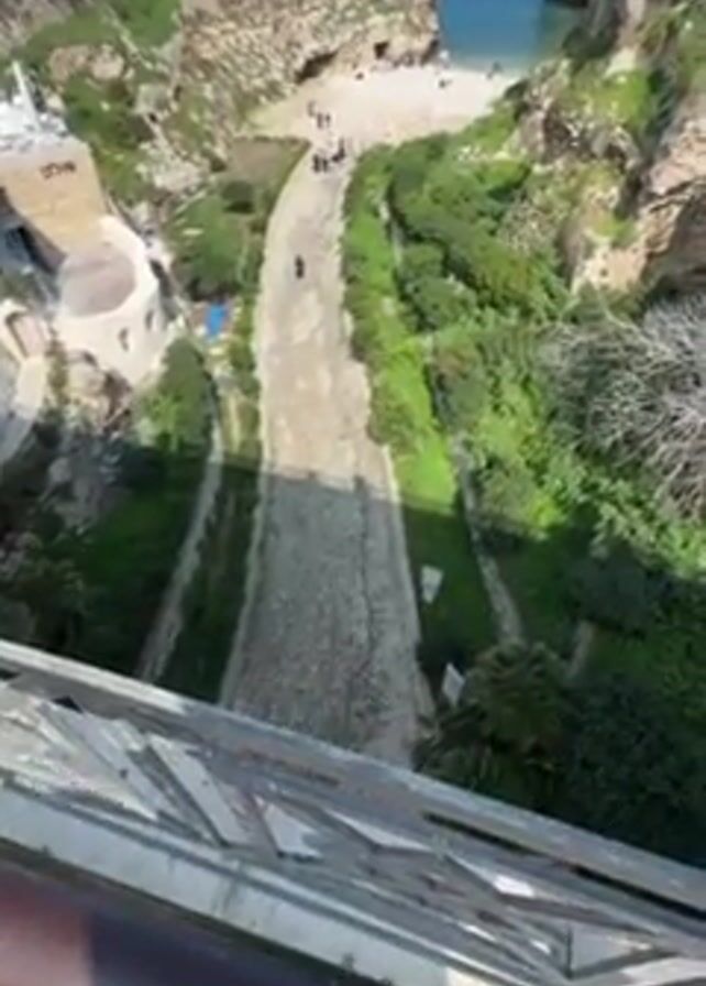 n elevated view from a bridge looking down at a narrow, stone-paved path leading towards a small beach framed by cliffs and buildings on either side