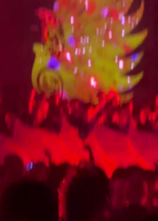 crowd of people at an event or concert. The crowd is lit with red light and appears to be enjoying the show, with some people holding up their phones to record. On stage, there's a large, glowing yellow and red decorative piece shaped like a bird with wings, and it is being projected with colorful moving lights. In front of the stage, performers are holding up what appear to be red fans or banners, adding to the visual spectacle. The atmosphere seems lively and energetic.