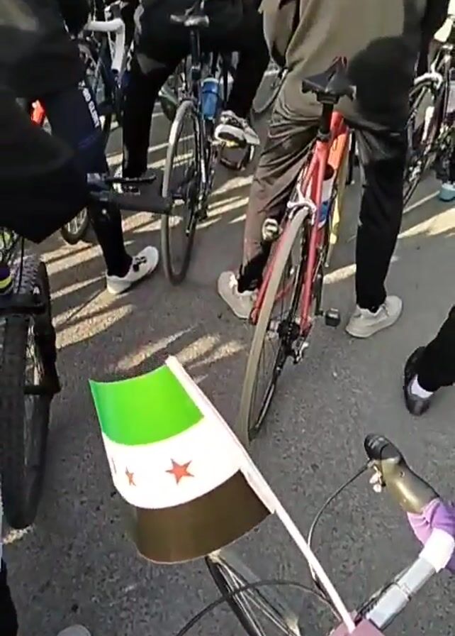 A crowd of cyclists wearing helmets gathers beneath an inflatable archway, seemingly preparing to embark on a ride. Many are astride their bicycles. One bicycle, featuring a light purple frame, is adorned with a Syrian flag attached to its handlebars. The environment appears to be an urban street, with buildings visible in the distance beyond the archway. The day seems bright and clear.