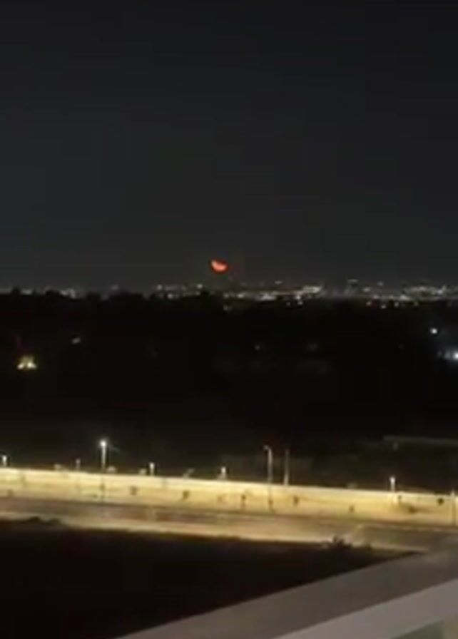 half moon at night, shot from a high vantage point. In the foreground, there is a bridge illuminated by streetlights, and beyond that a city skyline. The sky is dark, and the moon appears orange. The camera zooms in on the moon. Someone speaks in a language other than English.