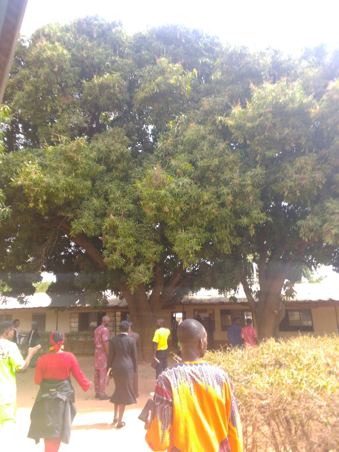 The image displays an outdoor scene in Saminaka, Nigeria, populated by approximately ten individuals. A large, mature tree with a dense canopy of green foliage dominates the upper two-thirds of the frame, with its thick trunk anchoring the center. Beneath the tree, an unpaved ground surface is visible. In the immediate foreground, two individuals are presented with their backs to the viewer. On the right, a person wears a yellow and dark-patterned long-sleeved shirt, holding a dark object. To their left, another individual is dressed in a red long-sleeved top and dark lower garments, carrying a dark item over their left arm. In the mid-ground, additional people are distributed: a person in a dark suit or dress with a light collar, a man in a red and white patterned traditional tunic, and an individual in a bright yellow t-shirt. Further back, near the building, other figures are partially visible, including one in a blue shirt and another in a red shirt. A single-story building with light-colored walls and a corrugated metal roof extends across the background, partially obscured by the tree's trunk and foliage. Windows and doorways are discernible on the building's facade. A dry, shrubby hedge with reddish-brown foliage is present in the right foreground. The scene is brightly illuminated by direct daylight, indicating an overhead sun.