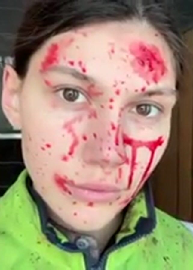 woman in a green safety vest standing in what appears to be a public restroom with multiple stalls. She is covered in what seems to be blood splatters and smears on her face and vest. The blood is concentrated around her forehead and dripping down her face. She is looking directly at the camera with a serious expression. The background is a neutral-toned restroom with wooden stall doors.