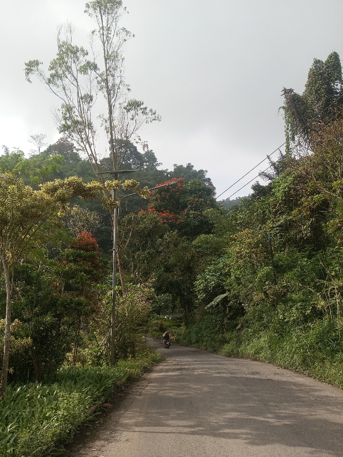 A winding asphalt road cuts through a dense, tropical forest. Lush greenery, including tall trees and thick undergrowth, lines both sides of the path. A single figure on a scooter travels along the road. Overhanging utility lines stretch across the sky. The day is overcast with a grey sky.