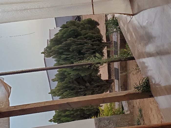 A slightly tilted outdoor shot features a lush, green tree centered in the frame. Architectural elements, possibly parts of a building or veranda, border the view. The tree's foliage appears dense, obscuring a building in the background. The ground is visible, showing some bare earth and small plants. The overall lighting is soft, suggesting overcast conditions.