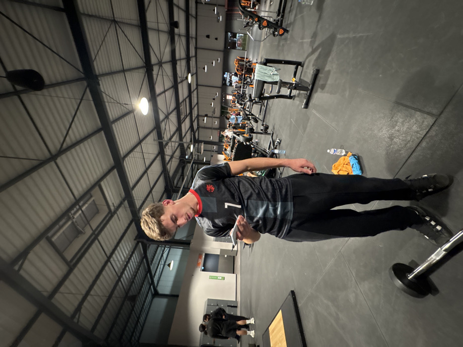 This image depicts the interior of a fitness center, identified as likely being a Basic-Fit gym located at 15 Rue des Vosges, 67800 Hœnheim, France. In the foreground, a young adult male stands centrally, facing slightly to his right. He has light brown hair and is wearing a dark grey and black athletic t-shirt with a red collar trim and a white number "7" on the chest, along with a dark emblem on the left chest. He wears dark athletic pants and black athletic shoes with white accents. He is holding a white smartphone in both hands and looking down at its screen, appearing to be interacting with it. His left hand shows dark-colored nail polish. A metallic barbell plate is partially visible on the dark grey rubber floor in the lower left foreground. The environment is a spacious, high-ceilinged room with exposed dark metal trusses and a corrugated ceiling. Multiple circular light fixtures are suspended from above. The floor is covered with dark grey interlocking rubber mats. In the mid-ground and background, numerous pieces of gym equipment are visible, predominantly featuring black frames with orange padded seats and accents, consistent with the Basic-Fit brand. These include various weight machines, benches, and cardio equipment. To the main subject's right, on the floor, a clear plastic water bottle, an orange towel, and a blue towel are present. Further right, a black weight bench has a grey towel draped over it. Several other individuals are scattered throughout the gym in the background, some appearing to be using equipment or standing. On the left side of the image, two individuals in dark athletic wear stand near a raised platform with a light-colored top. Behind them is a light-colored wall with an orange-framed doorway or opening and a green vertical sign displaying the number "1". No direct interactions between the main subject and other individuals are observed; the main subject's attention is focused on his phone.