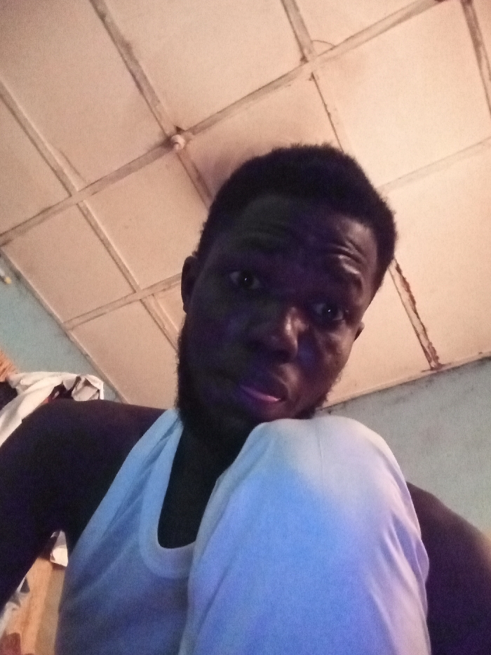 A male individual with dark skin, short dark hair, and a dark beard is captured in a close-up, low-angle shot within an indoor environment. He is wearing a white tank top and looks directly at the camera with a neutral expression, his tongue slightly protruding. Part of a white garment is visible over his bent left knee on the lower right of the frame. The background consists primarily of a light-colored, grid-patterned ceiling with visible seams and some discoloration. To the left, a portion of a light blue wall and some folded white and dark fabric are visible. The specific location within Toto, Nigeria, cannot be determined from the provided visual information.