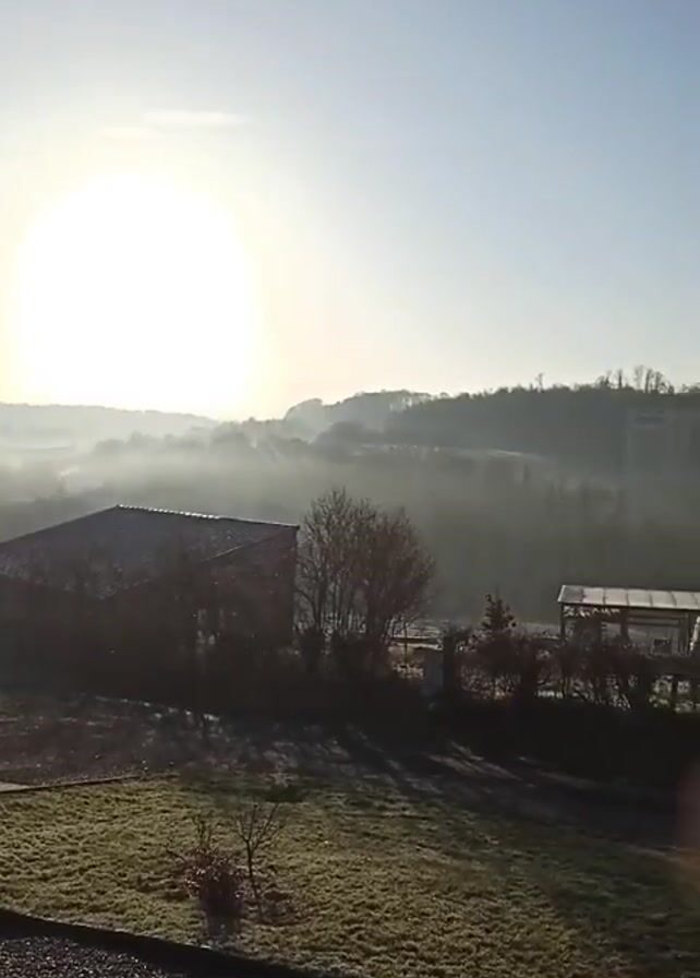 rural landscape on a sunny day. There is a field with frost on the grass in the foreground, with a house to the left and a shed to the right of the field. Beyond the field is a line of trees and hills covered in fog. The sun is bright in the sky. The camera slowly pans to the right.