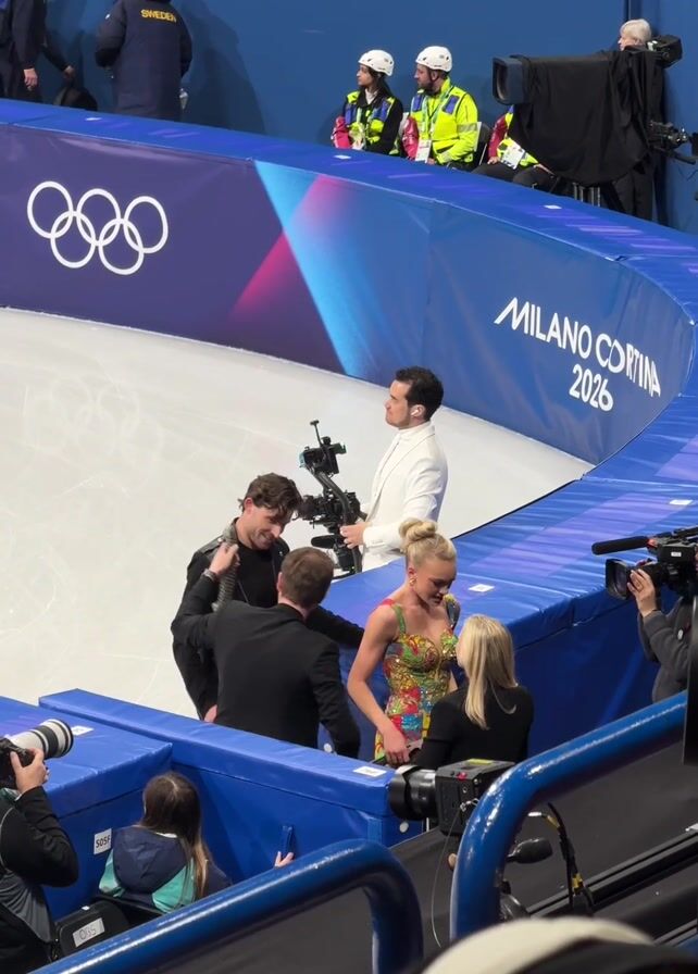 figure skater, dressed in a multicolored sparkly dress, standing by the edge of an ice rink, giving an interview. She is surrounded by camera operators and interviewers. One interviewer in a black suit hugs her. Behind them, the rink wall displays the Olympic rings and "MILANO CORTINA 2026". In the background, seated in chairs, are two emergency medical personnel wearing helmets and yellow vests. Several other individuals are standing in the background, including one wearing a jacket labeled "SWEDEN".