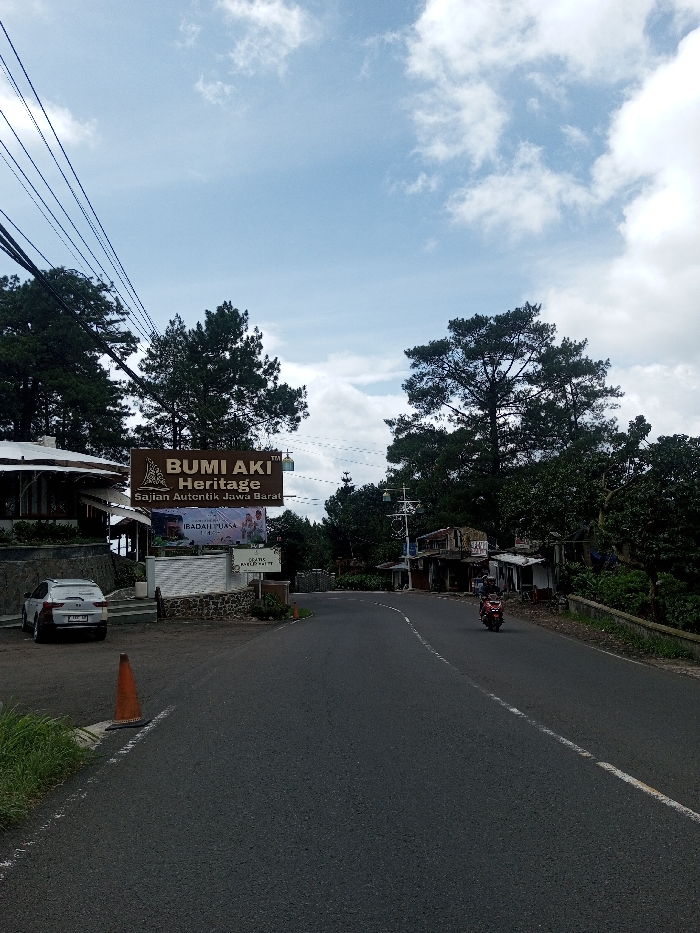 The image depicts an outdoor, daytime scene on a paved two-lane road, described as being in Gubbisamamidi, India. The sky above is light blue with scattered white clouds. On the left side of the road, an off-white SUV is parked facing away from the viewer, partially obscured by a dark grey stone retaining wall topped with white. Behind this wall and vehicle, a multi-level building complex with white walls and dark roofs is visible, surrounded by dense evergreen trees. A prominent brown rectangular sign stands on the left, displaying "BUMI AKI Heritage" and "Sajian Autentik Jawa Barat," with a smaller white banner below reading "IBADAH PUASA." Utility lines are visible in the upper left quadrant. An orange traffic cone rests on the asphalt shoulder in the foreground on the left. The road, which features a dashed white center line, gently curves to the right. On the right side of the road, a red scooter, ridden by a person wearing a helmet, travels away from the camera. Beyond the scooter, several rustic, small commercial structures with corrugated metal roofs and simple facades line the road, interspersed with dense foliage and large trees. A low concrete barrier runs along the right edge of the road.