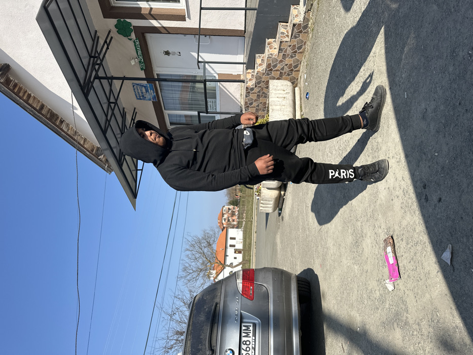 The image depicts a male subject standing on an asphalt surface in front of a white building in Marinka, Bulgaria, under a clear blue sky. The subject is an adult male, standing upright with his head slightly bowed and turned to the viewer's right. He is wearing a black hooded sweatshirt with the hood up, black sweatpants featuring the word "PARIS" printed vertically in white on the lower left leg, and black sneakers. A small, light-colored fanny pack with a visible "Nike" logo is worn around his waist. His hands are not visible. Strong shadows are cast on the ground to his left. To the subject's left, the rear of a silver BMW 5 Series (E61 Touring model) is partially visible. The Bulgarian license plate "P 568 MM" is clearly readable. The vehicle's right taillight is visible. Behind the subject, to the right of the frame, is a white, two-story building with brown-trimmed windows and an entrance featuring a brown and beige mosaic-tiled staircase. A metal-framed awning with a translucent roof extends over the entrance. Above the door, a green clover-shaped sign reads "ОП. ДЕМЕТИНА" in Cyrillic. Below it, a blue sign with white Cyrillic text is partially visible, and a yellow sign below that reads "CAMO ЗA PЪЦE" (For hands only). In the mid-ground, behind the BMW, a white building with a red-tiled roof and a small belfry or cupola is visible, consistent with a church or historical structure. Other residential buildings are also in the distance. Several bare deciduous trees are scattered in the background. Overhead wires are visible against the sky. On the asphalt surface in the foreground, near the lower left, a crumpled pink wrapper and a small white piece of paper are present. A light-colored, rectangular concrete planter is situated between the subject and the building's entrance.