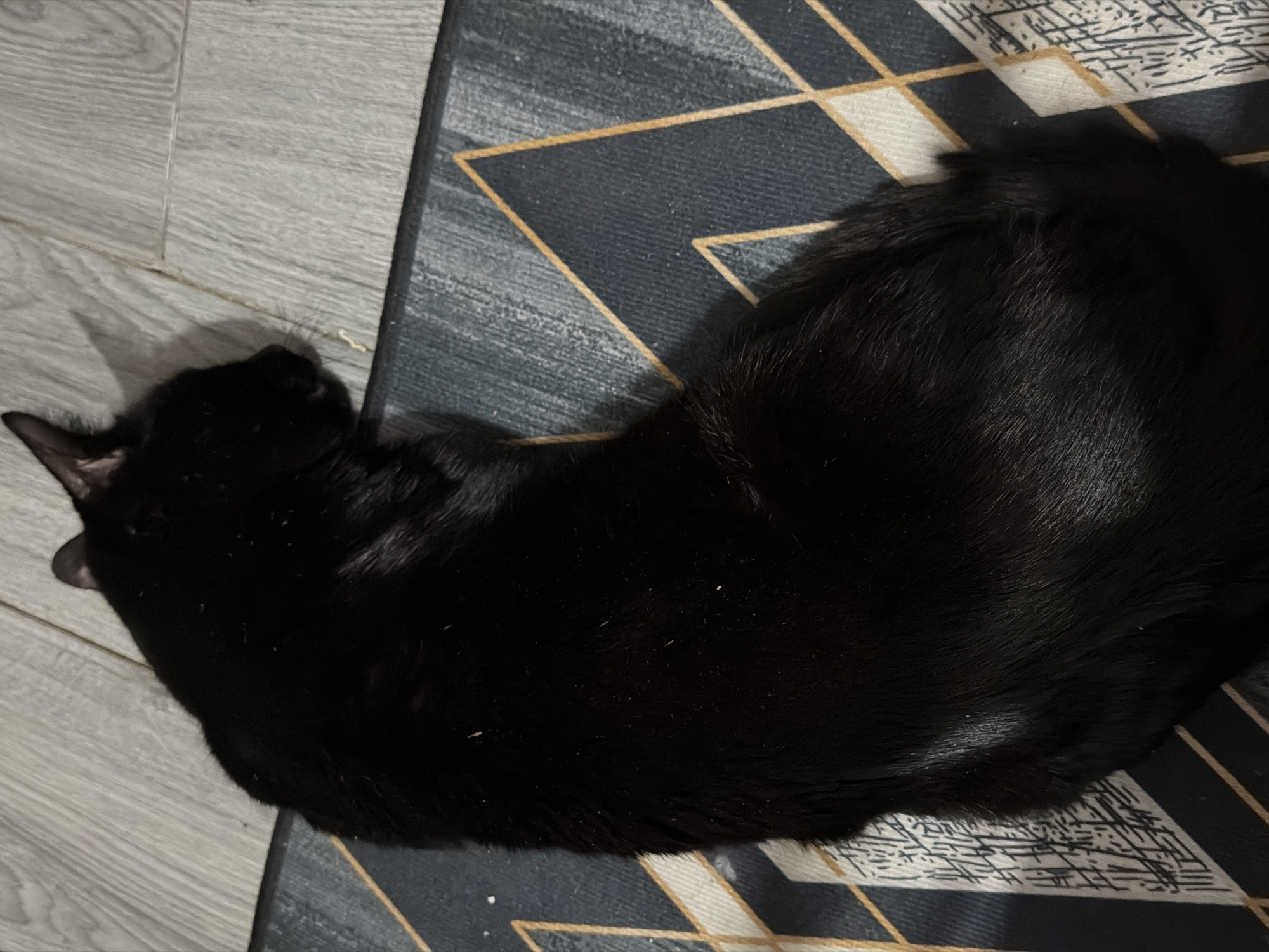 A black cat is lying on a rug with a geometric pattern. The rug is located on a floor composed of light grey wood-patterned planks. The top of the rug has a grey and black geometric pattern with gold trim. The location is unknown but the prompt mentions the city of Pentre, United Kingdom.